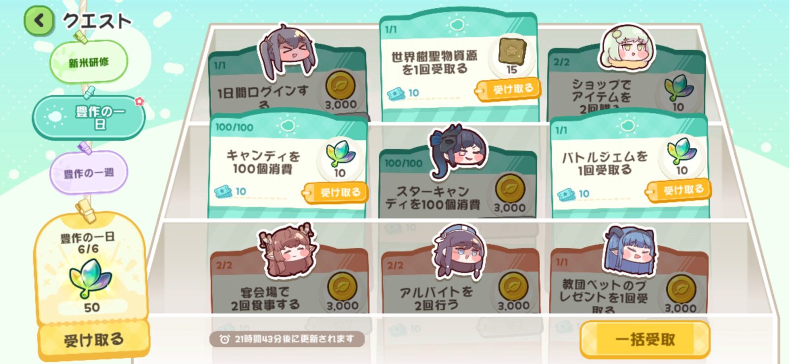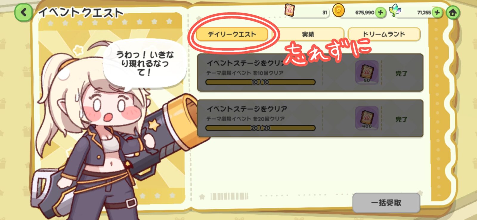 メイン画面の右上にある[クエスト]から、デイリークエストを達成して報酬を受け取りましょう。