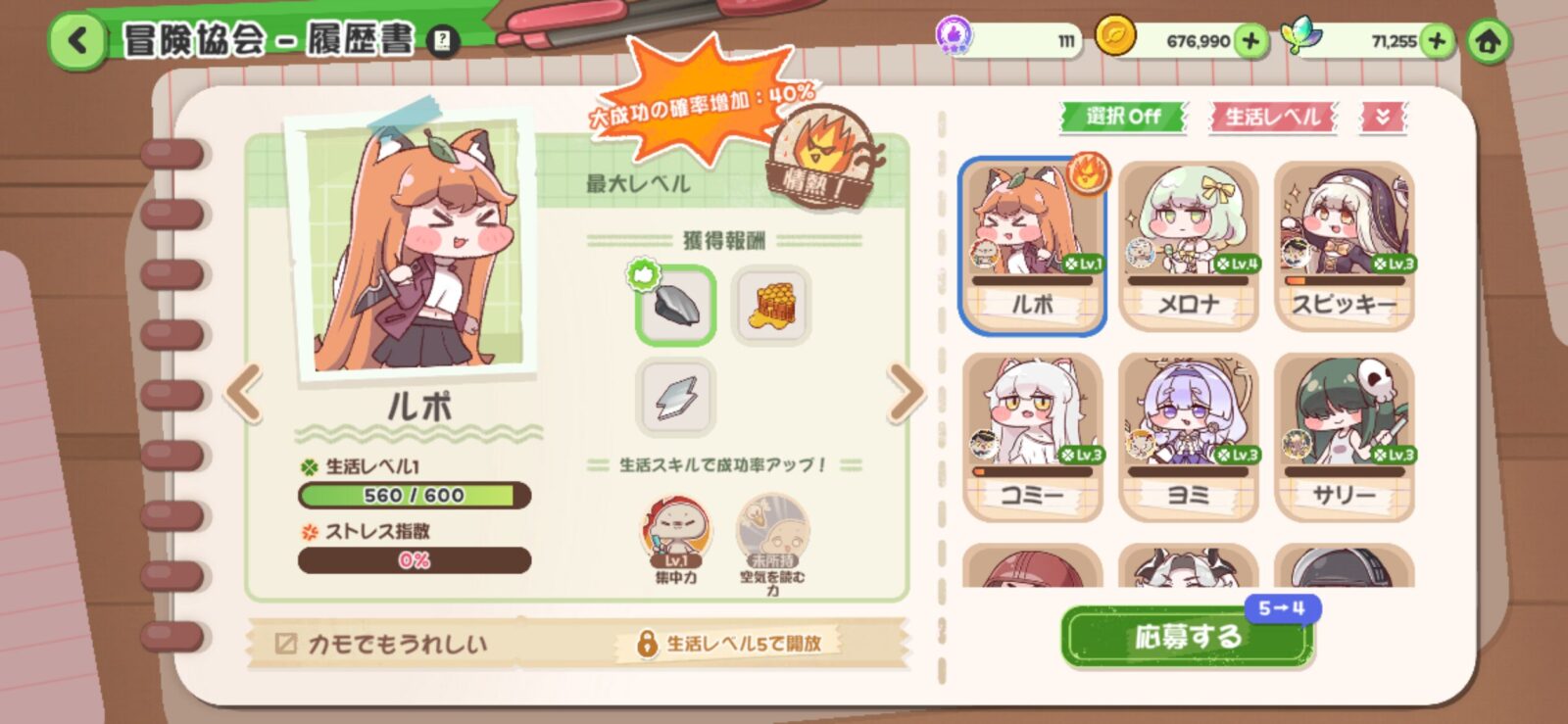 [冒険協会]でアルバイトをして、施設レベルアップ用素材などの重要アイテムを集めます。
