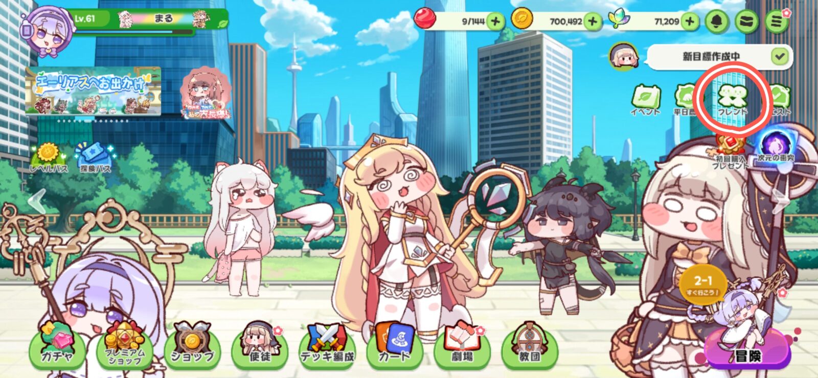画面右上の[フレンド]から、リーフポイントを一括受取&一括送付しましょう。