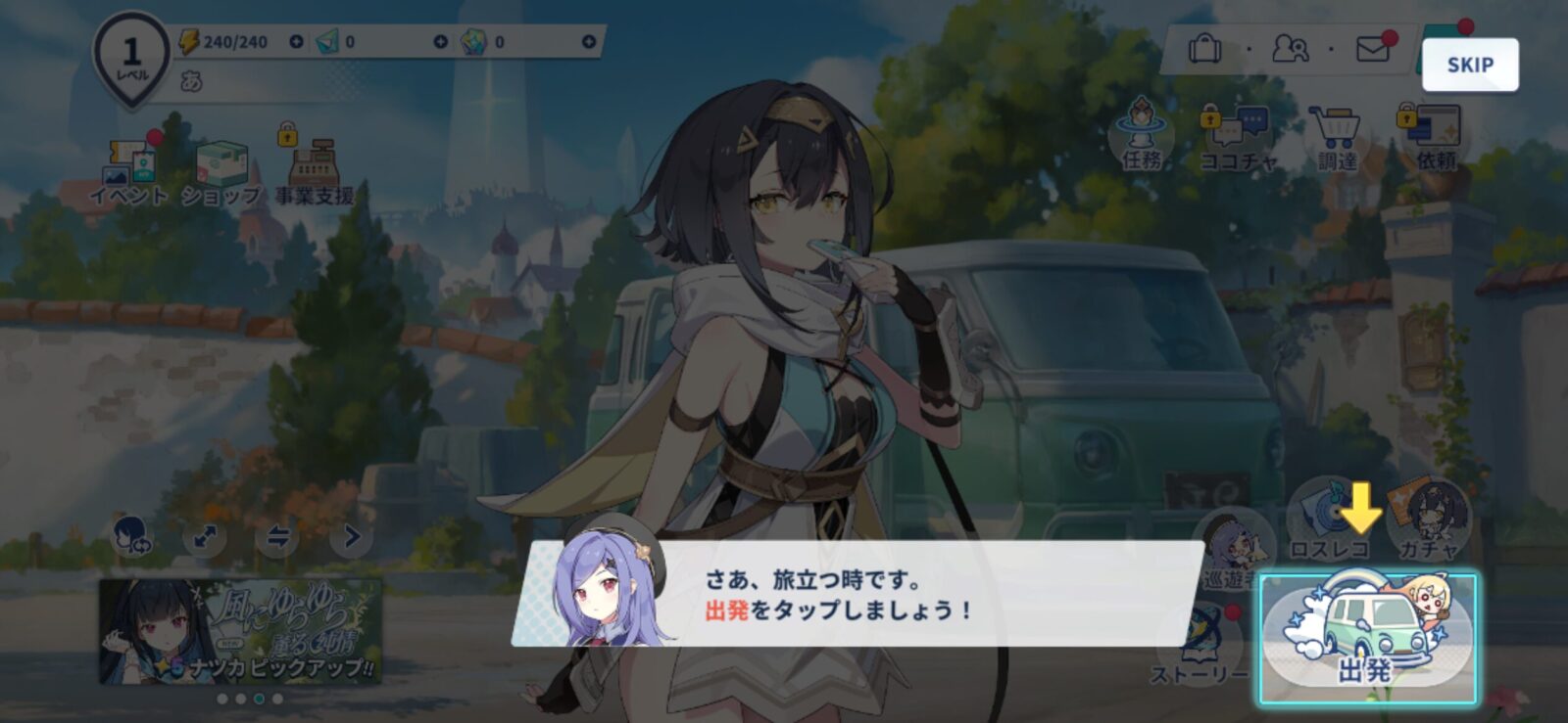 - ガチャ画面からホームに戻り、[出発しましょう]をスキップ